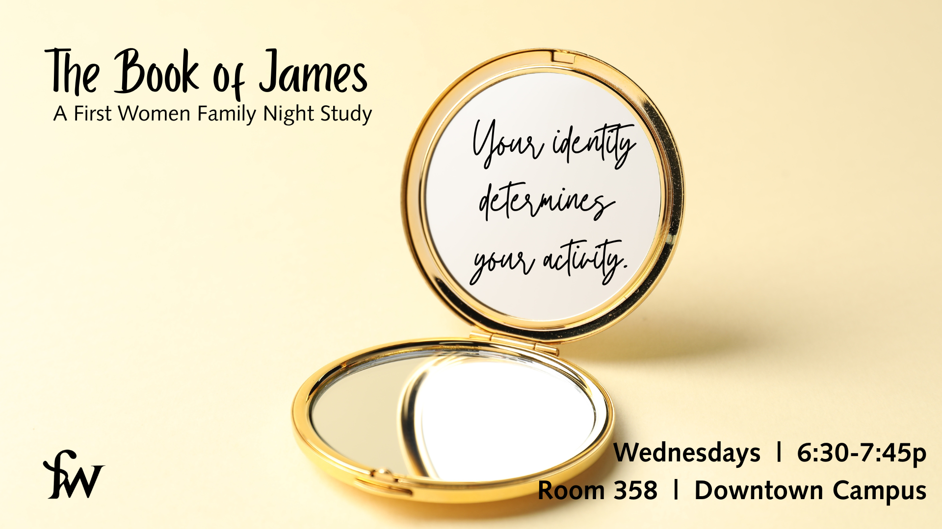 Ladies! I can’t wait for us to dig into the book of James, beginning on January 14. I believe the quote I recently heard that “..our identity determines our activity”. In other words, who you are shows in what you do. James has some direct words for us, living in our identity in Christ and how it will show in our actions. I so hope you’ll join me! Studying the Word is so rich when we get to do it together. See you in room 358, Downtown Campus, beginning January 14.
