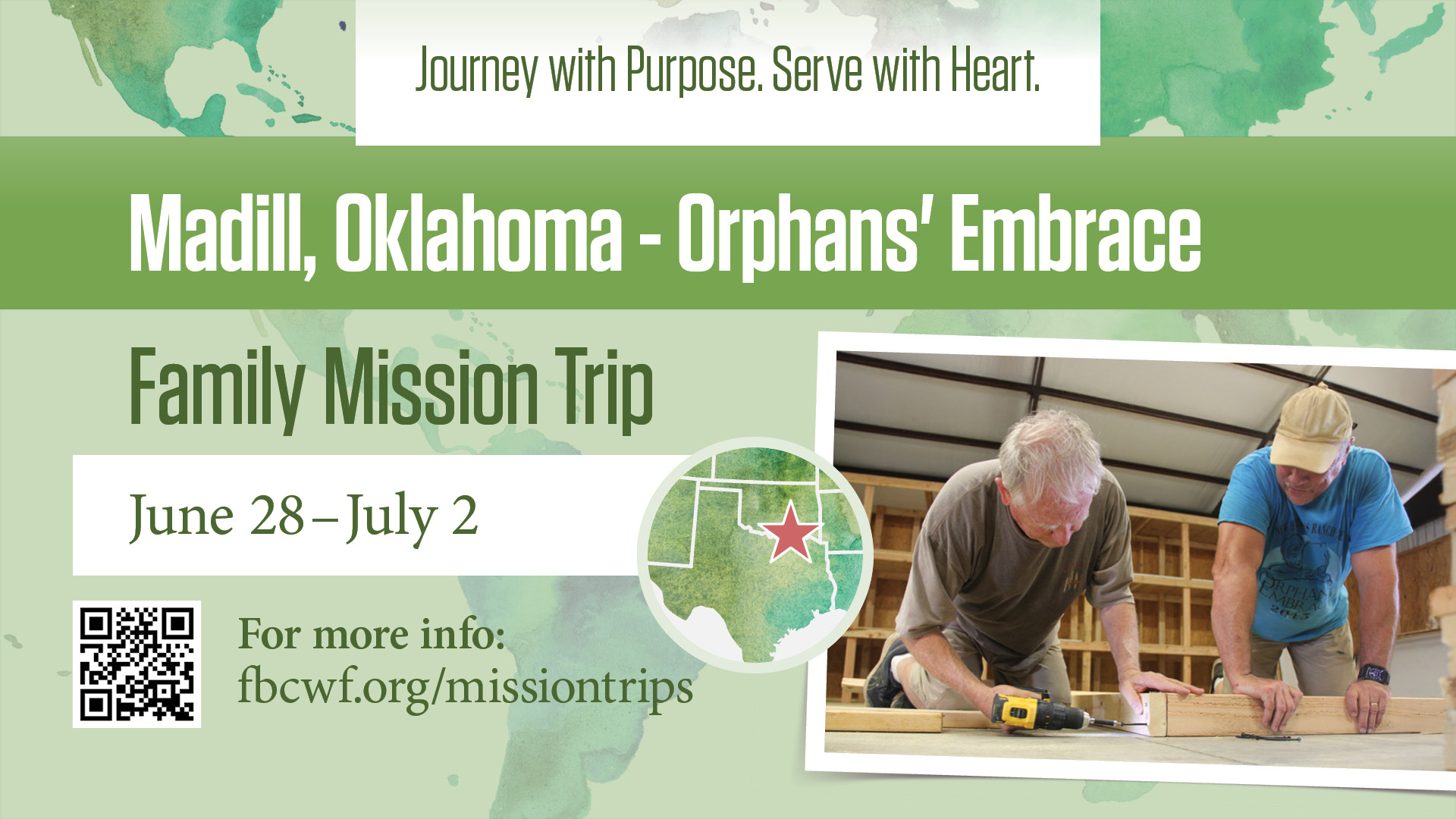 Once again a team from our church will journey a couple of hours away to the Sooner State to minister to both the residents and staff of the Baptist Home for Girls. Over the years we have established a wonderful partnership with this great ministry. From construction projects to fellowship opportunities, to Bible studies, we are making a difference in Madill, Oklahoma. This family-oriented trip features opportunities for young and young at heart to bless others with the love of Jesus.