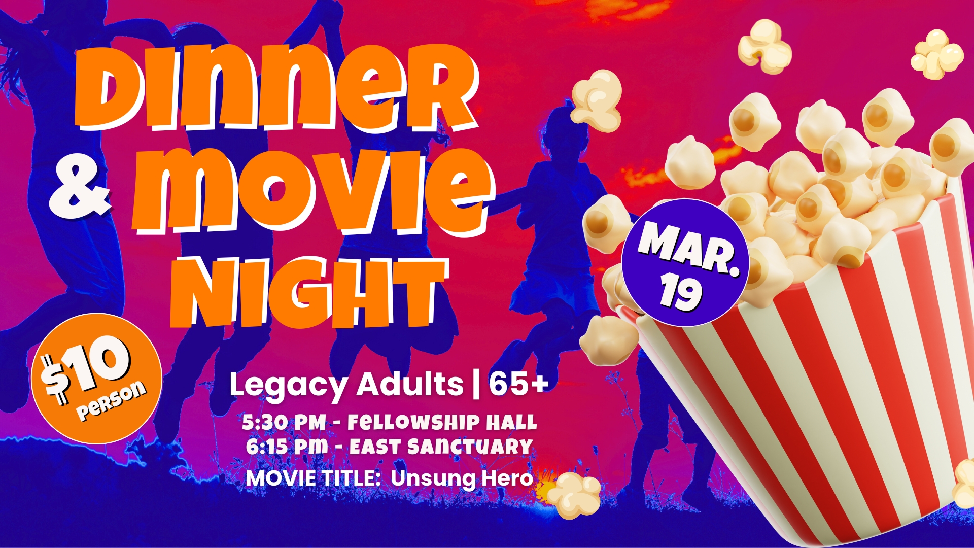 Join us for Legacy Dinner & Movie Night, Thursday, March 19th. Dinner at 5:30pm and Movie at 6:15pm. Downtown Campus Fellowship Hall.