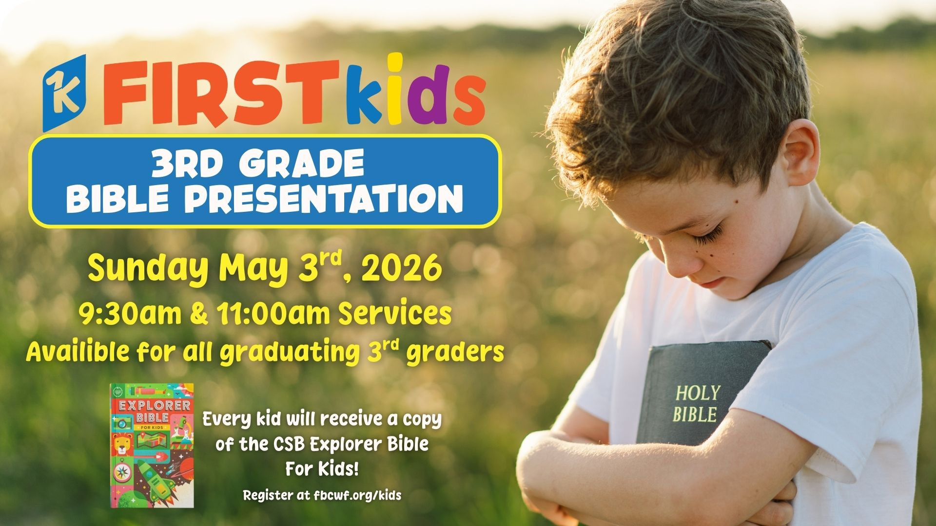 FIRSTkids 3rd Grade Bible Presentation, Sunday May 3rd for all graduating 3rd Graders. Every kid who participates will receive a copy of the CSB Explorer Bible for Kids!