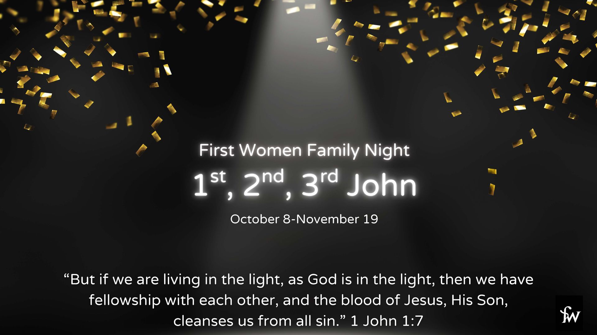 New class starting October 8! Join us for this special 7-week First Women Family Night class, where we will be going through the books of 1st, 2nd, and 3rd John. No better time than now to be reassured of your place in the Kingdom, your position in God’s heart, and a renewed desire to take that hope to those who don’t know Him. All you need is your Bible and a heart to dig in.