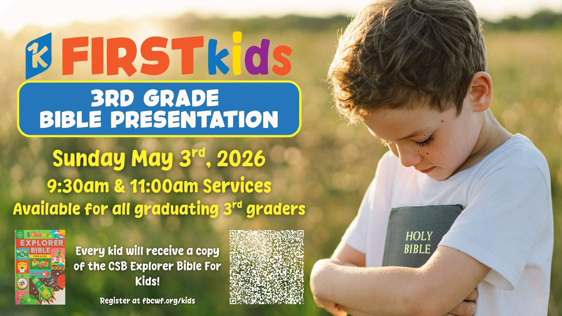 FIRSTkids 3rd Grade Bible Presentation, Sunday May 3rd for all graduating 3rd Graders. Every kid who participates will receive a copy of the CSB Explorer Bible for Kids!